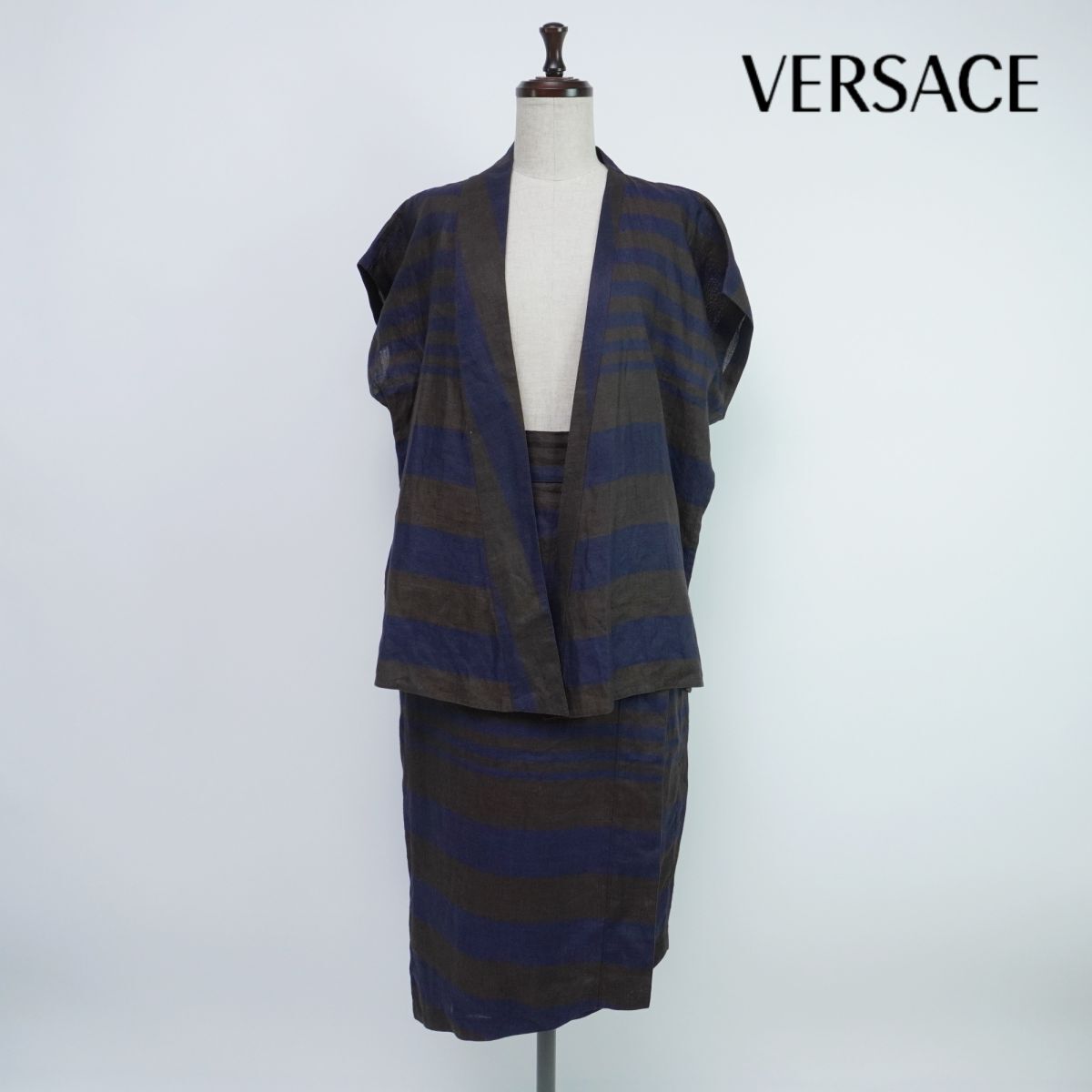 - 美品 GIANNIVERSACE ジャンニヴェルサーチ リネン100% セットアップ 半袖ブラウスシャツ ラップスカート レディース 紺系 サイズ40*QC444