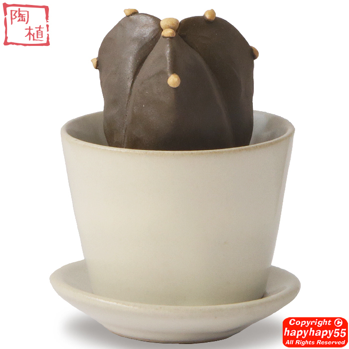 - ■陶器のサボテン 陶植 ランポー玉 三角 益子焼3号鉢+受け皿セット 一輪挿し機能付き◆おしゃれな インテリア オブジェ 観葉植物 作家物