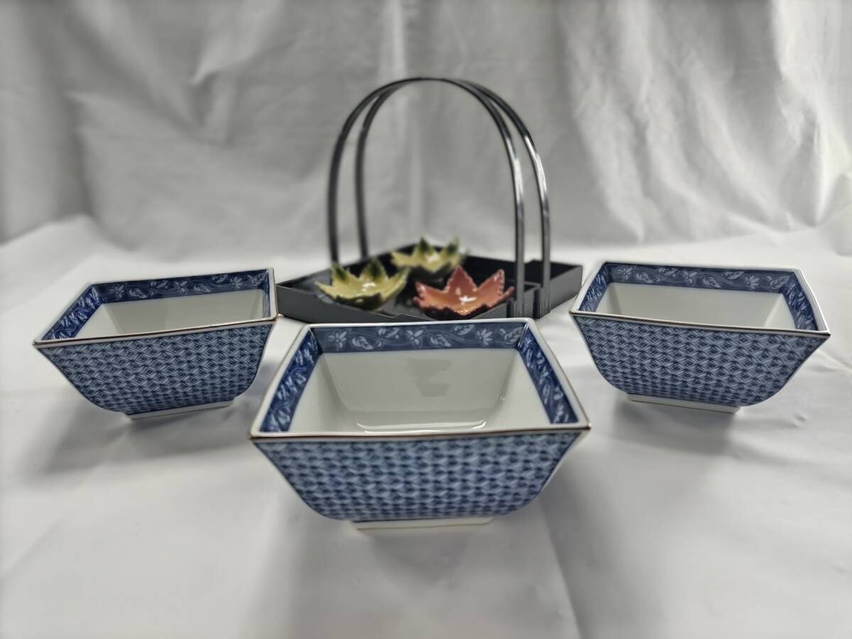 > 單龜【美品】白峰 角鉢 3客揃 用途多彩 角小鉢 小鉢 皿 日本 伝統 和風 焼物 陶器 おもてなし 会食 おうちごはん シンプル 白 青