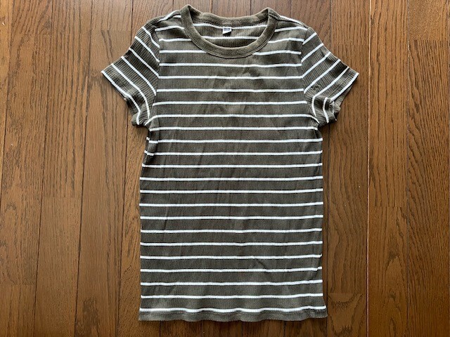 > ユニクロ 半袖 ストレッチ ニット S 肩幅30㎝ 身幅36㎝ 着丈56.5㎝ 袖丈13.3㎝ グリーンブラウン×ホワイト、白 送料無料 底値