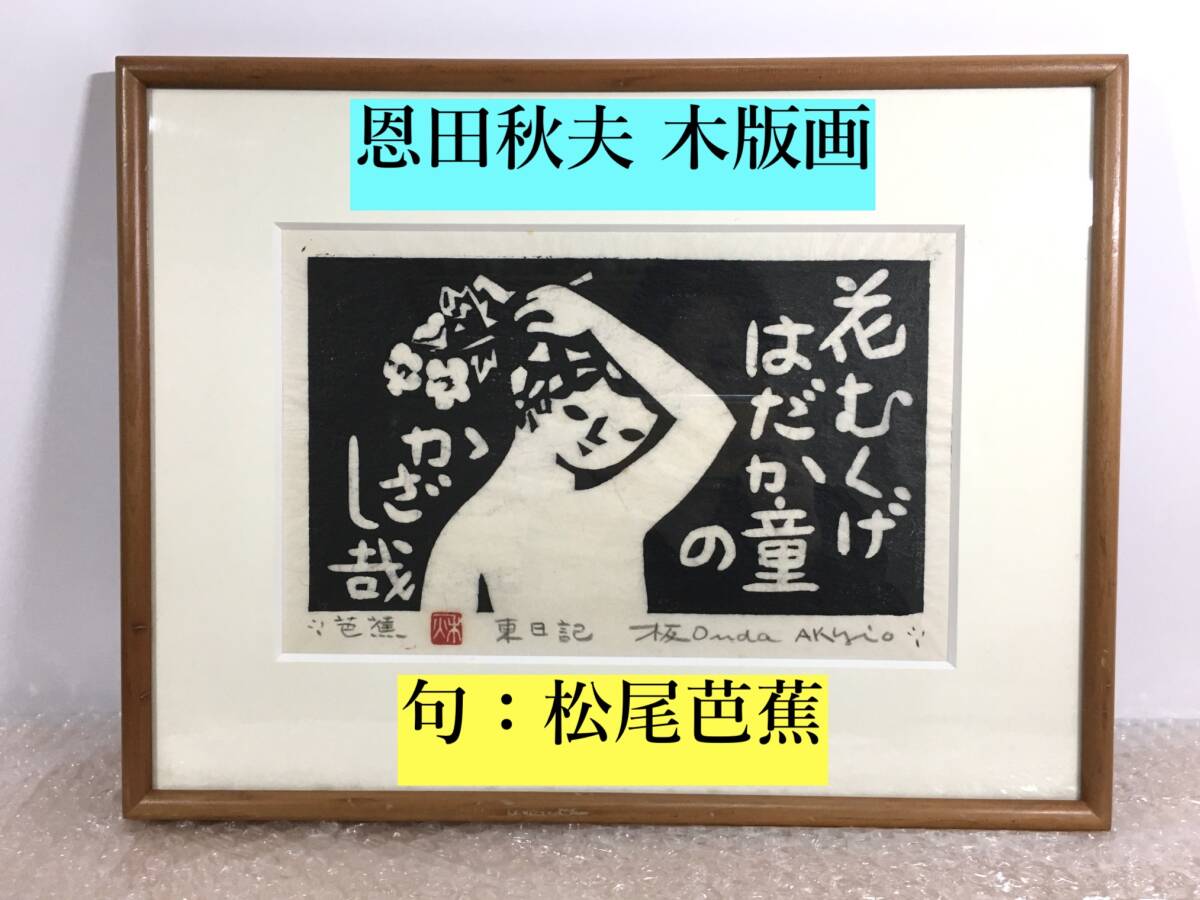 > ○真作保証品 恩田秋夫 木版画 句: 松尾芭蕉「花むくげ はだか童の かざし哉 東日記」師: 棟方志功 版画 額装 サイン/落款有 真作保証品