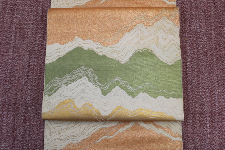 > きもの今昔7380 袋帯 西陣織 色箔引き箔地山並み横段柄 緑と茶色箔 折り目の箔が擦れています
