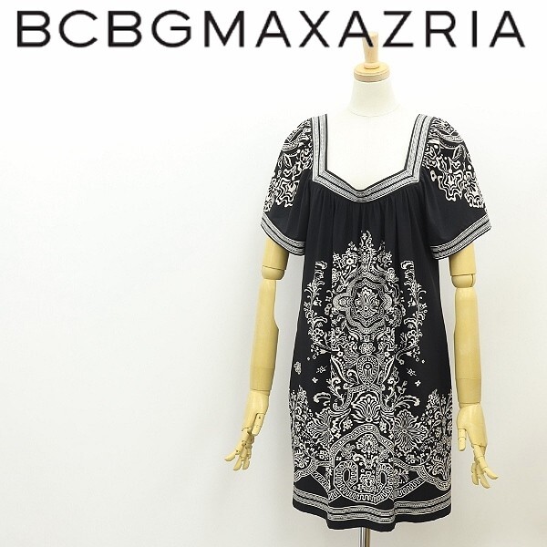 - ◆BCBG MAXAZRIA マックスアズリア 総柄 ギャザー スクエアネック ワンピース 黒 ブラック×アイボリー L