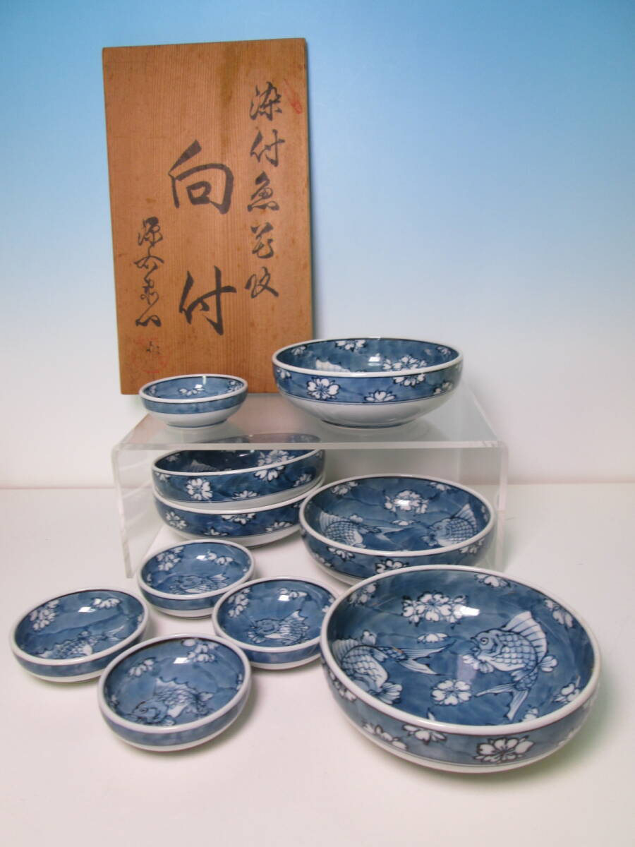 - ☆舘林源右衛門 染付 魚と桜の花文 鉢 五&豆小鉢 五 共箱お料理屋さんの器/茶懐石/割烹/日本料理