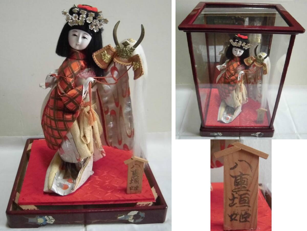 - かなり古い 人形 八重垣姫 木製 ガラスケース入り 兜 武田菱 蒔絵 わらべ人形 日本人形 工芸品 置物 飾り物 レトロ