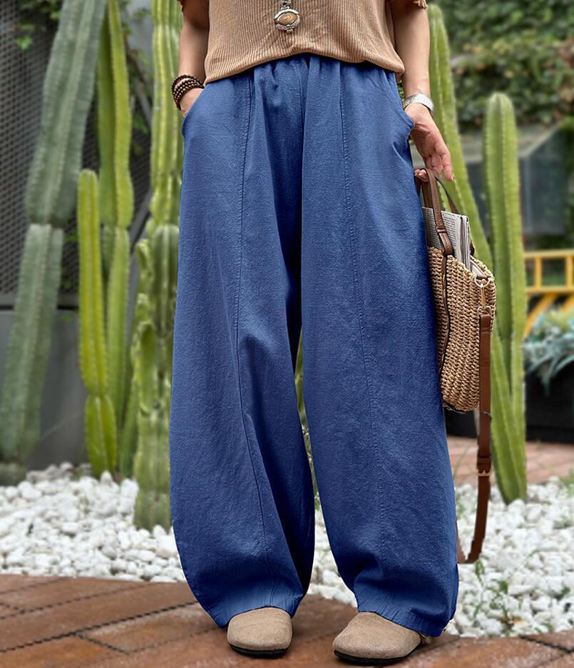 - 新入荷*秋新作 綿麻 ガウチョパンツ レディース ボトムス ワイドパンツ ロング丈 ウエストゴム ゆったり 大きいサイズ パンツ*ブルー