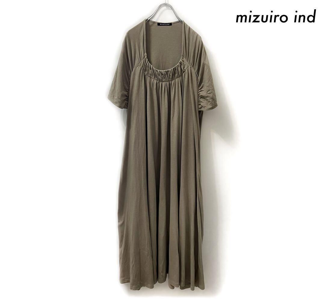 - 【送料無料】mizuiro ind ミズイロインド★半袖ワンピース 首元シャーリング カーキ