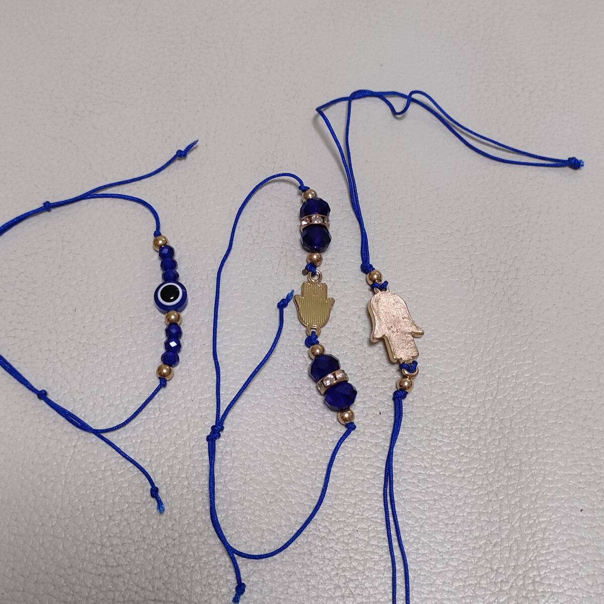 - 未使用 新品 ブレスレット チャーム 3点セット ラインストーン ビーズ 魔除け ミサンガ ブルー