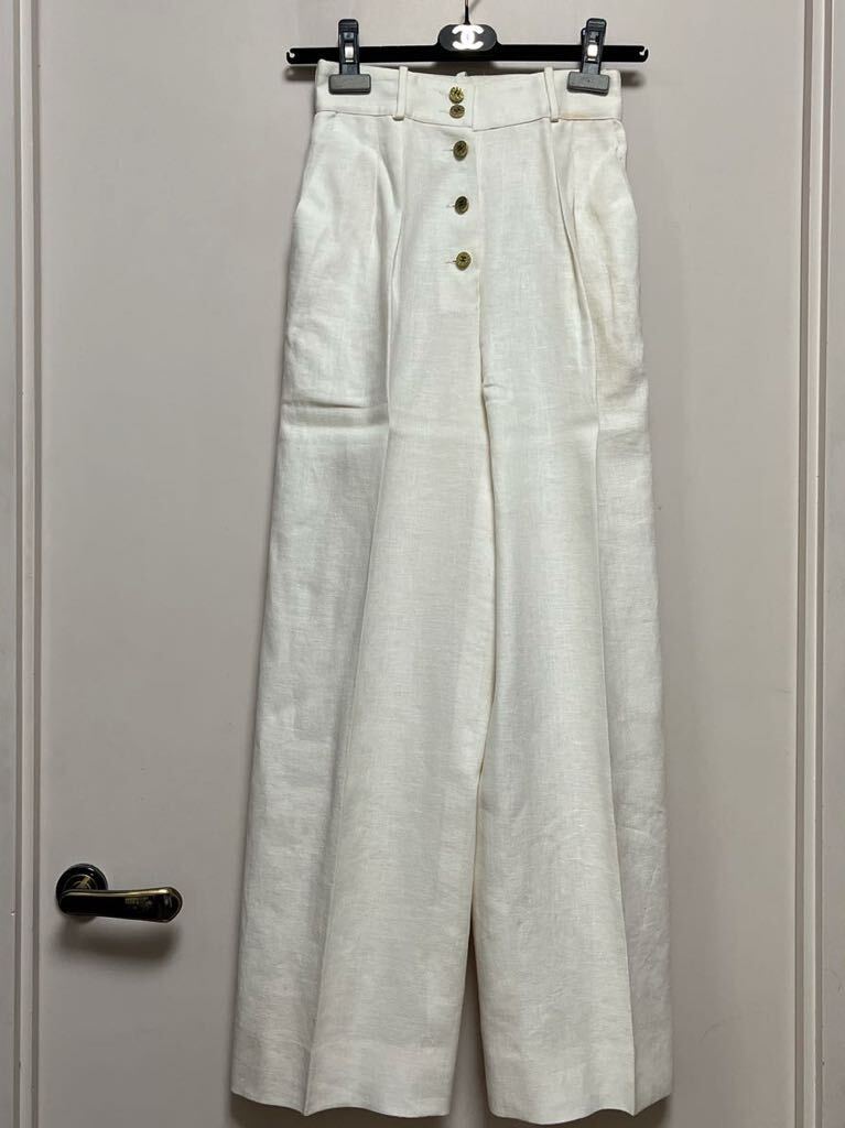 - CHANEL リネン ワイドパンツ タック ゴールドボタン 36 裏地ありシルク オフホワイト