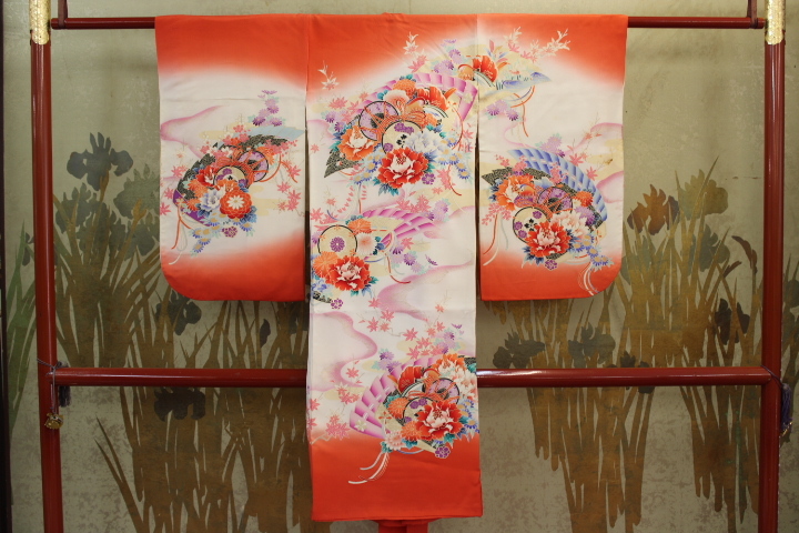 - きもの今昔7446 子供のきもの 宮参り女児一つ身きもの 天地赤ボカシ 花がらと鼓の柄 少し汚れあります
