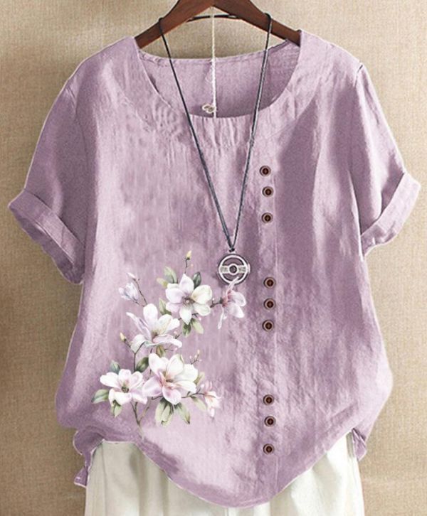 > 人気推薦 / 夏新作 上品 大人 花柄 ブラウス 大きいサイズ 綿麻 カジュアル きれいめ プリント柄 半袖 トップス チュニック / パープル