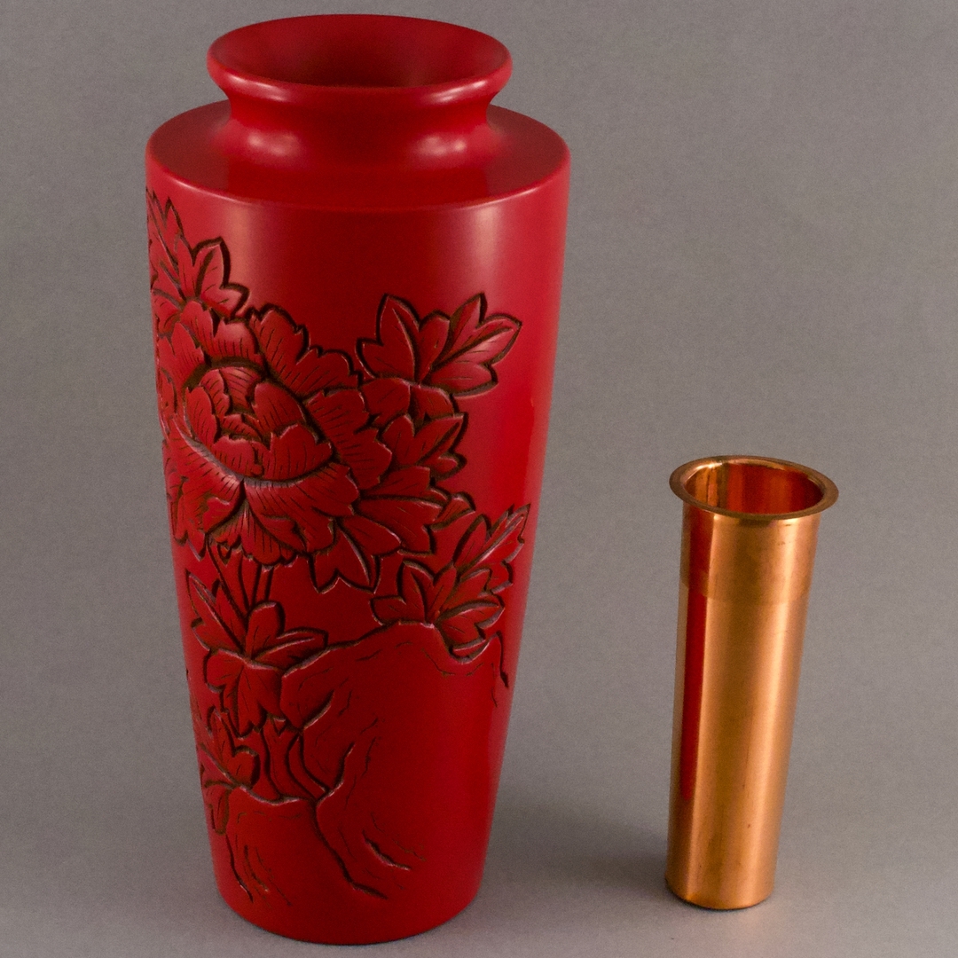- 立身花瓶 村上 木彫堆朱(ついしゅ) 無形文化財 川村謹製 未使用品