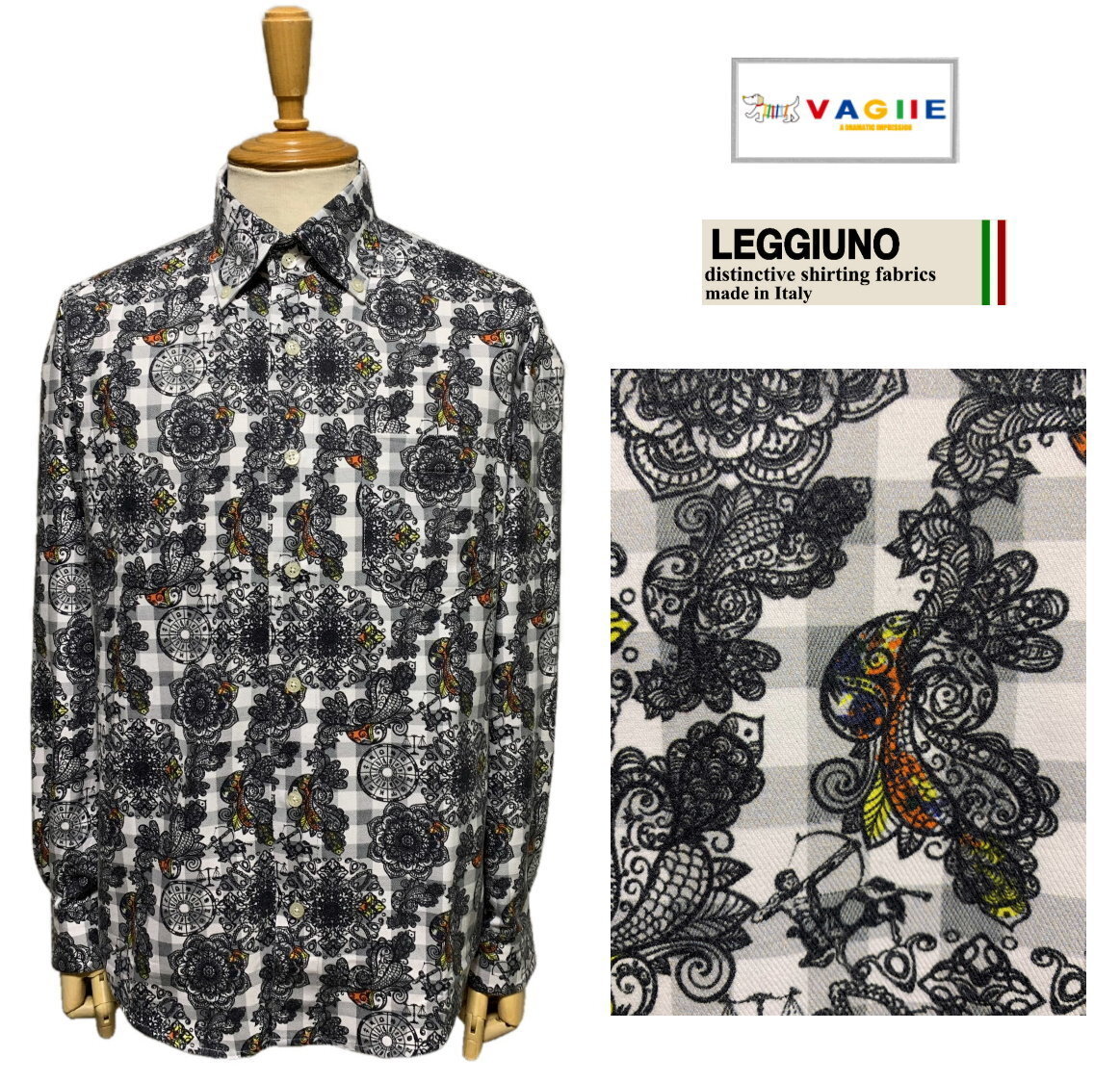 > VAGIIE バジエ イタリア製生地 ブロックチェックx幾何学フラワー&ペイズリー柄 ロゴボタン 長袖ボタンダウンシャツ 白x黒配色 size48 L