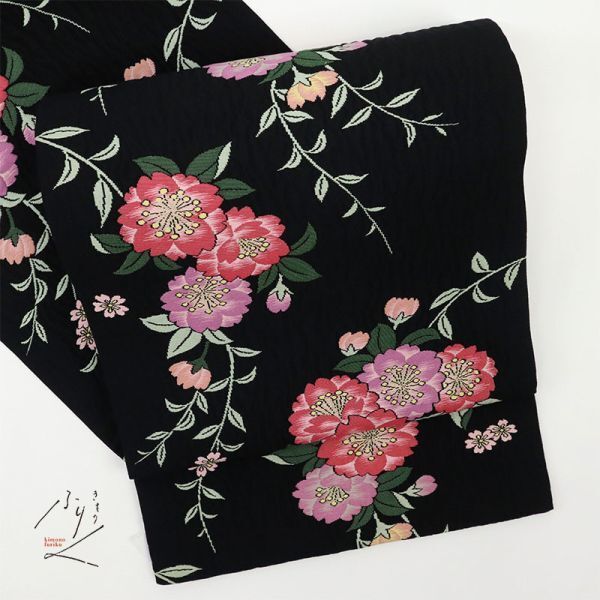 > 【袋帯】 桜の花柄 膨れ織り 六通柄 黒 ブラック 和装着物 8FB5