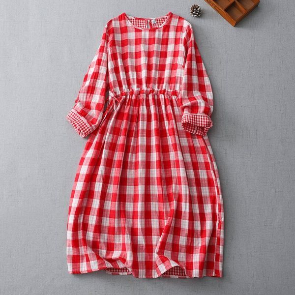 - 秋新品*ゆったり マキシワンピース リネンワンピース 大きいサイズ 綿麻 長袖 チェック柄 オフィス 通勤 着やせ ロングワンピース*レッド