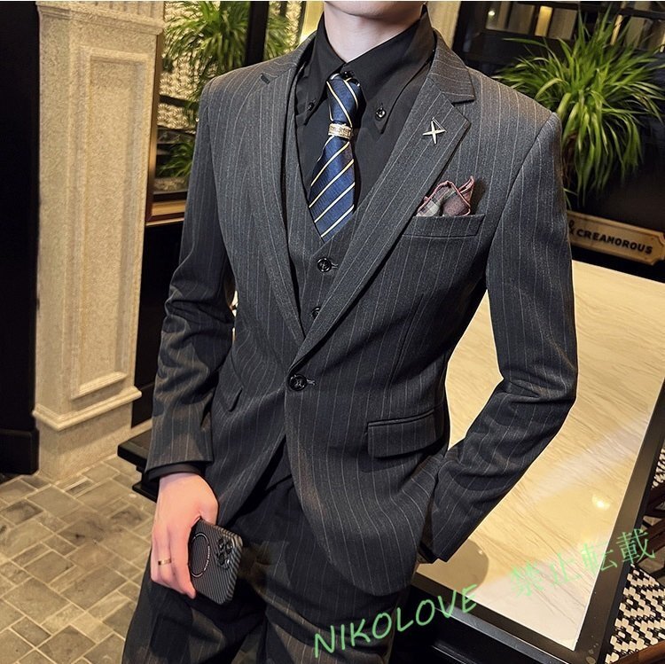 - 新品 スリーピース メンズ スーツセット シングルスーツ 3点セット ストライプ柄 背広 スタイリッシュ 結婚式 一つボタン グレー LG170