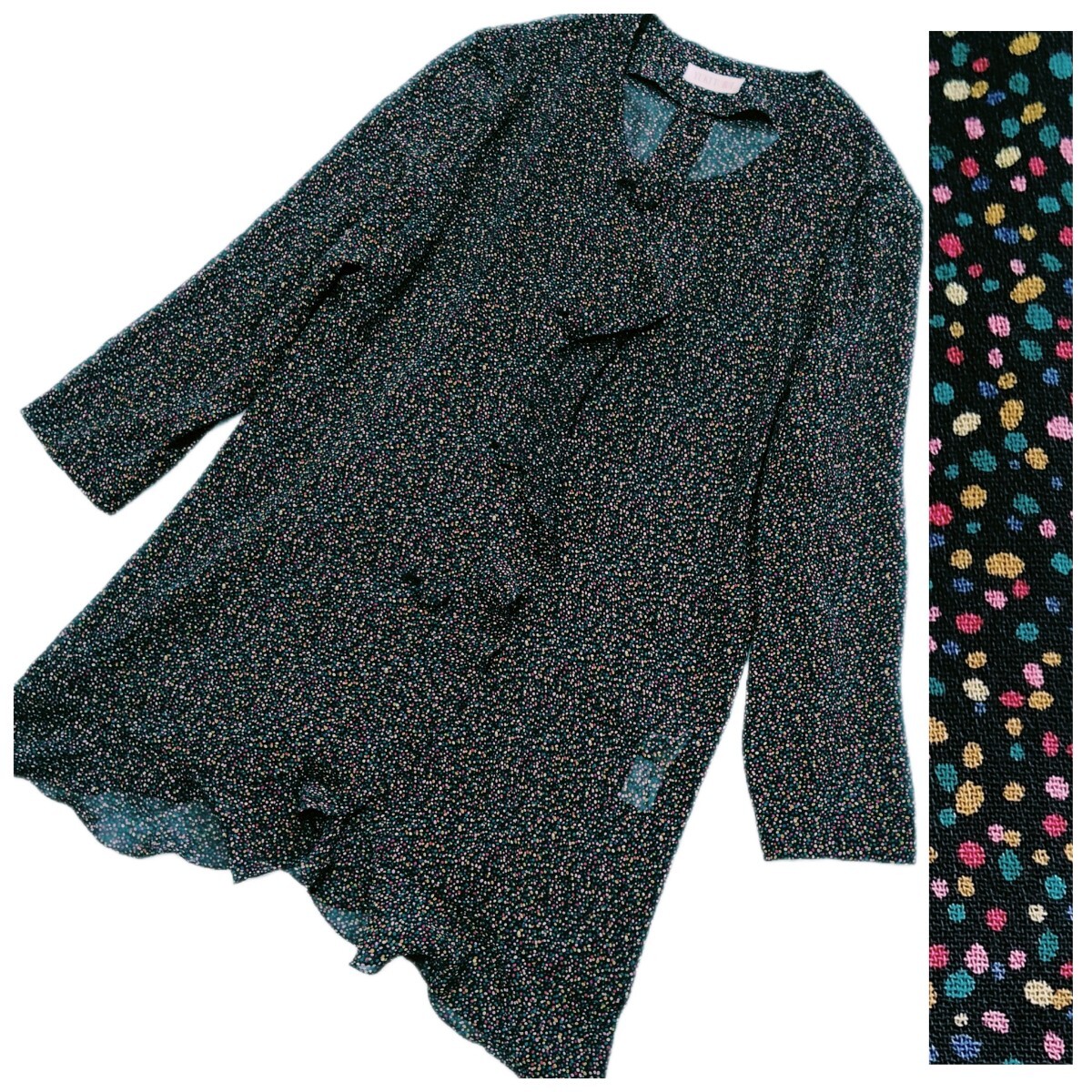 - YUKI TORII*ユキトリイ*透け感のあるミディ丈ブラウス*黒*カラフルドット柄*日本製*くるみボタン*長袖*ビィンテージ*ペプラム