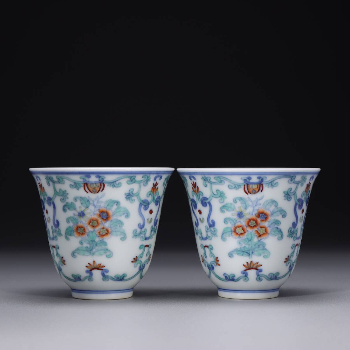 - 古陶芸 清時代・大清雍正年制 斗彩皺菊鈴杯一対 唐物 時代物 古陶芸 古賞物 AW-9103