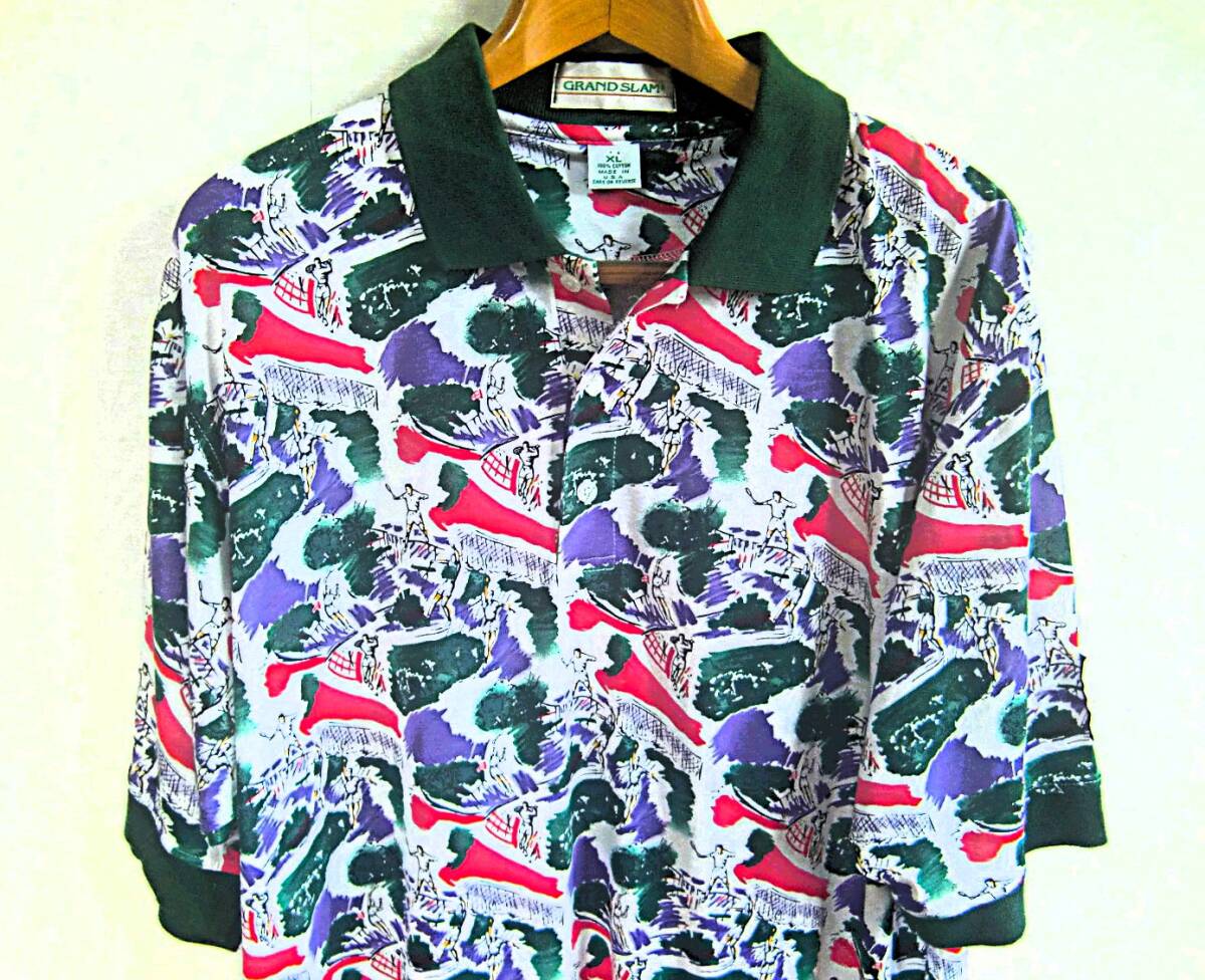 > 【美品即決 送料無料】USA GRANDSLAMグランドスラム ワッペンロゴ テニス総柄コットンストレッチ半袖ポロシャツ★メンズ3XL/大きいサイズ