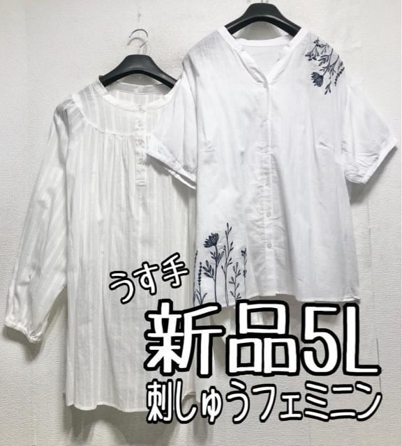- 新品☆5L♪白系♪刺しゅうフェミニンうす手トップス2枚セット☆b698