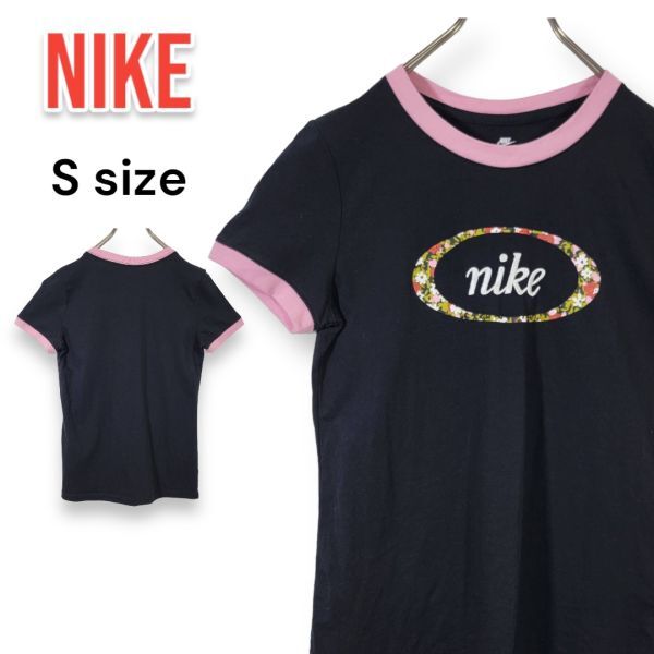 > レディース NIKE ナイキ ロゴ刺繍 花柄 プリント 半袖リンガーTシャツ Sサイズ ブラック 黒