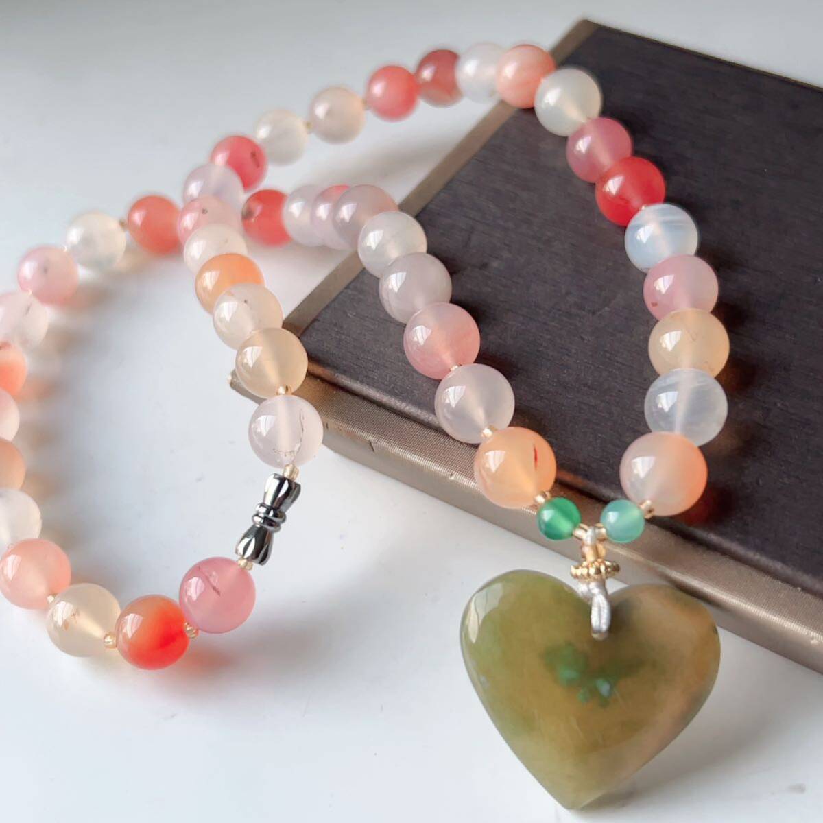 > ◇アゲート+桜瑪瑙(ハート形)◇メノウ◇ネックレス◇ペンダント◇パワーストーン◇天然石◇巾着袋付き◇プレゼントにも030P9184
