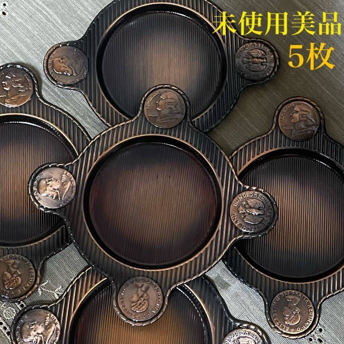 > レトロ 銅色 アンティーク調 金属 コースター 5枚 外貨モチーフ コイン絵柄 アメリカ イギリス フランス ドイツ 茶托 小皿 トレー 小物入れ
