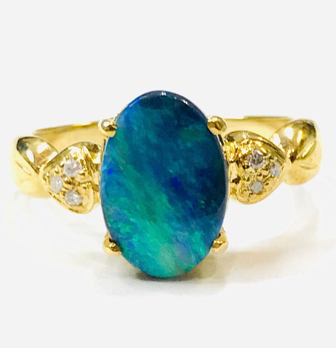 - 18K 天然 ブラックオパール/天然 ダイヤ 遊色リング 指輪 Ring イエローゴールド ソーティング付属 qoj.2042