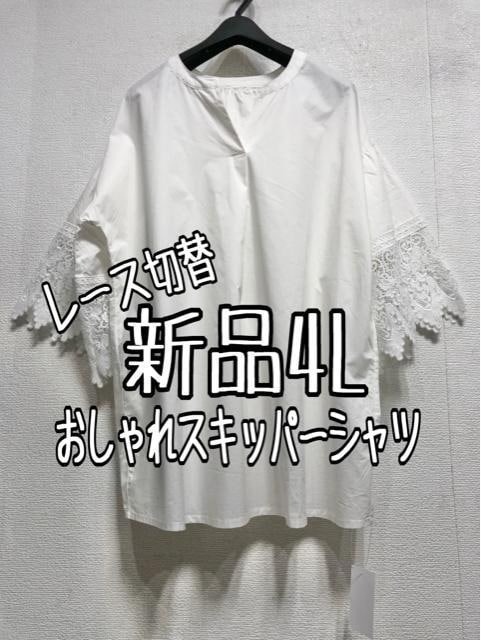 - 新品☆4L白系♪レース切替おしゃれキーネックシャツ☆b430