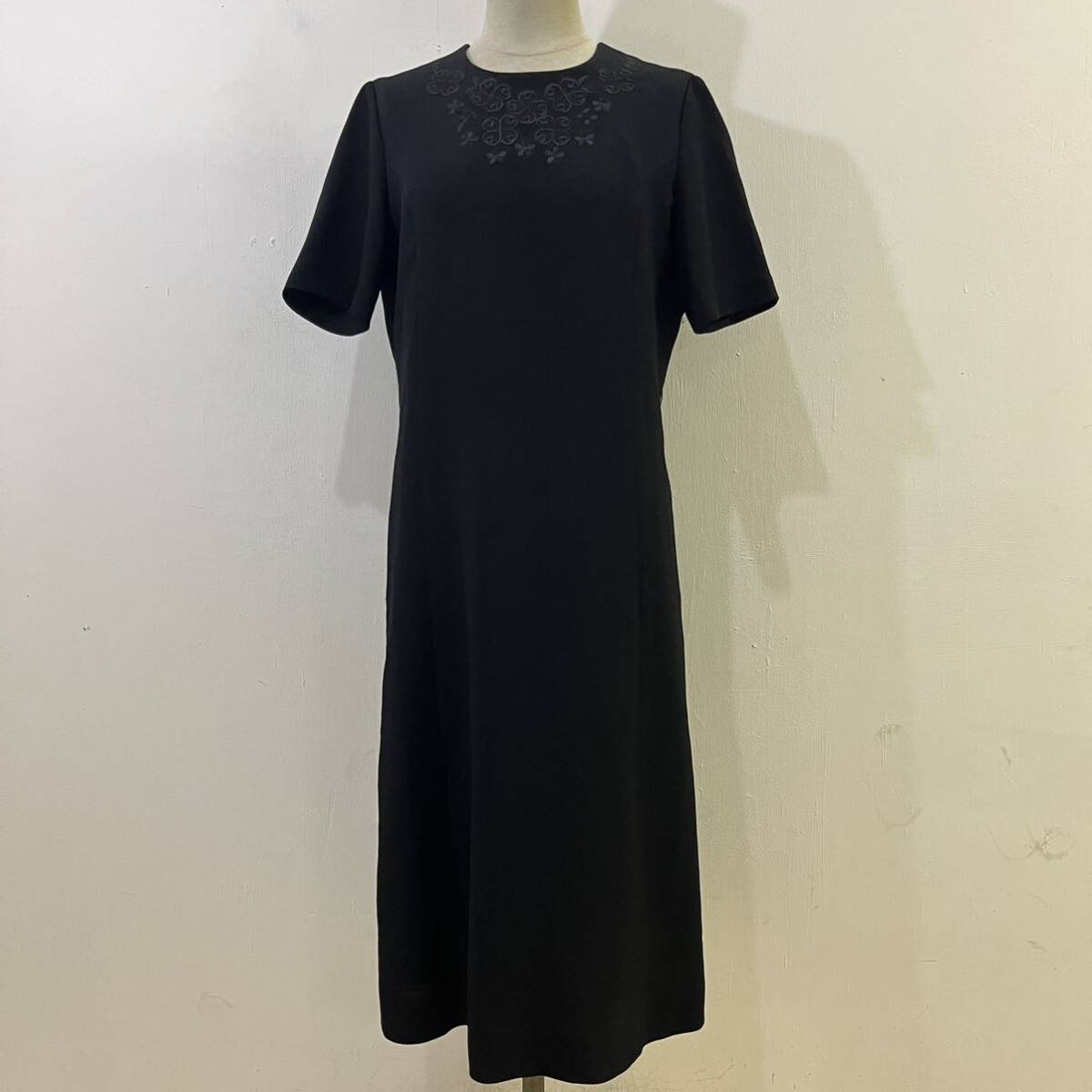 - 極上 ブラックフォーマル ロングワンピース 半袖ワンピース 花柄刺繍 デザインワンピース 黒 ブラック 上質 希少【送料一律/同梱可能】G