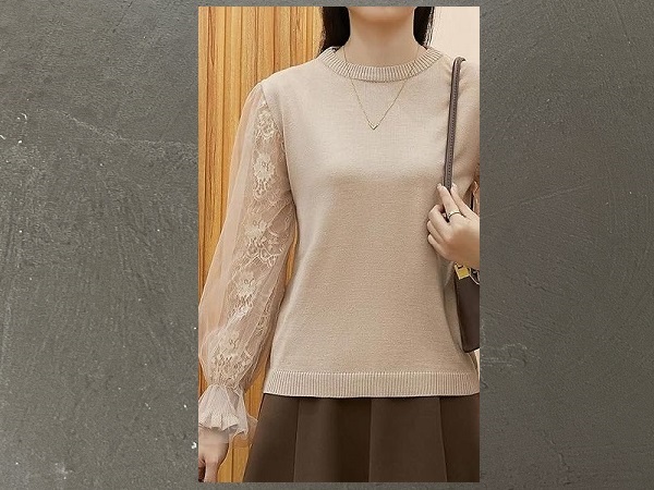 - ANCKDOCE レーススリーブニットトップス レディース 長袖 新品 アイボリー セーター 秋冬 秋 冬 ボリューム袖 レース フリル シフォン
