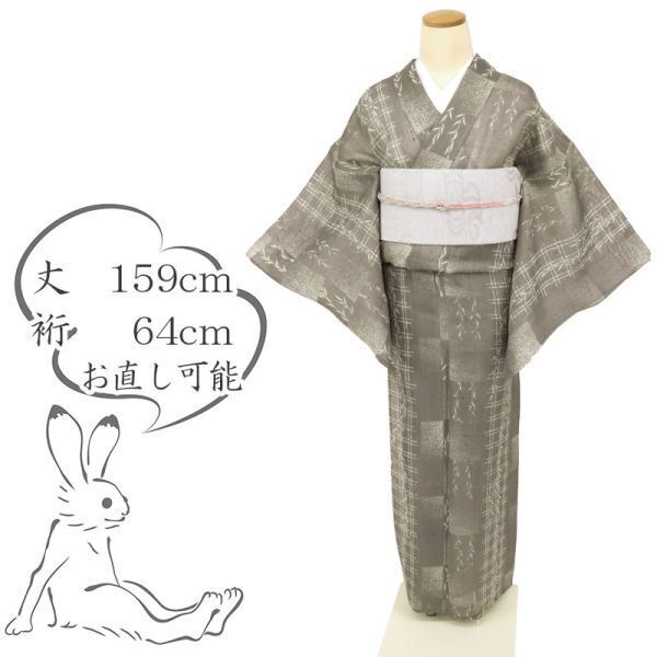 - 【小紋】 逸品 夏着物 『絹芭蕉』 横段叩き染め格子に涼やか柳 グレー 正絹 着物 TH4-16