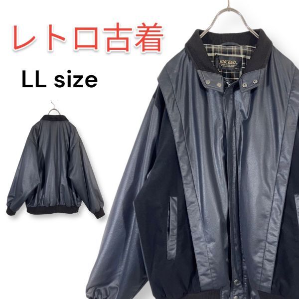 > 90s ブルゾン ジャケット 古着 レトロアウター LLサイズ 紺色 ネイビー レザー調 シティーボーイ ストリート ビンテージ