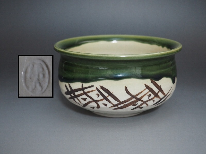 - A3278 織部焼 源水 作 織部建水 ☆ 茶道具 抹茶器 茶懐石 茶事 こぼし 建水 水覆 水翻 水下 納汚 陶器 作家物 在銘 陶印 美品 良品 無傷