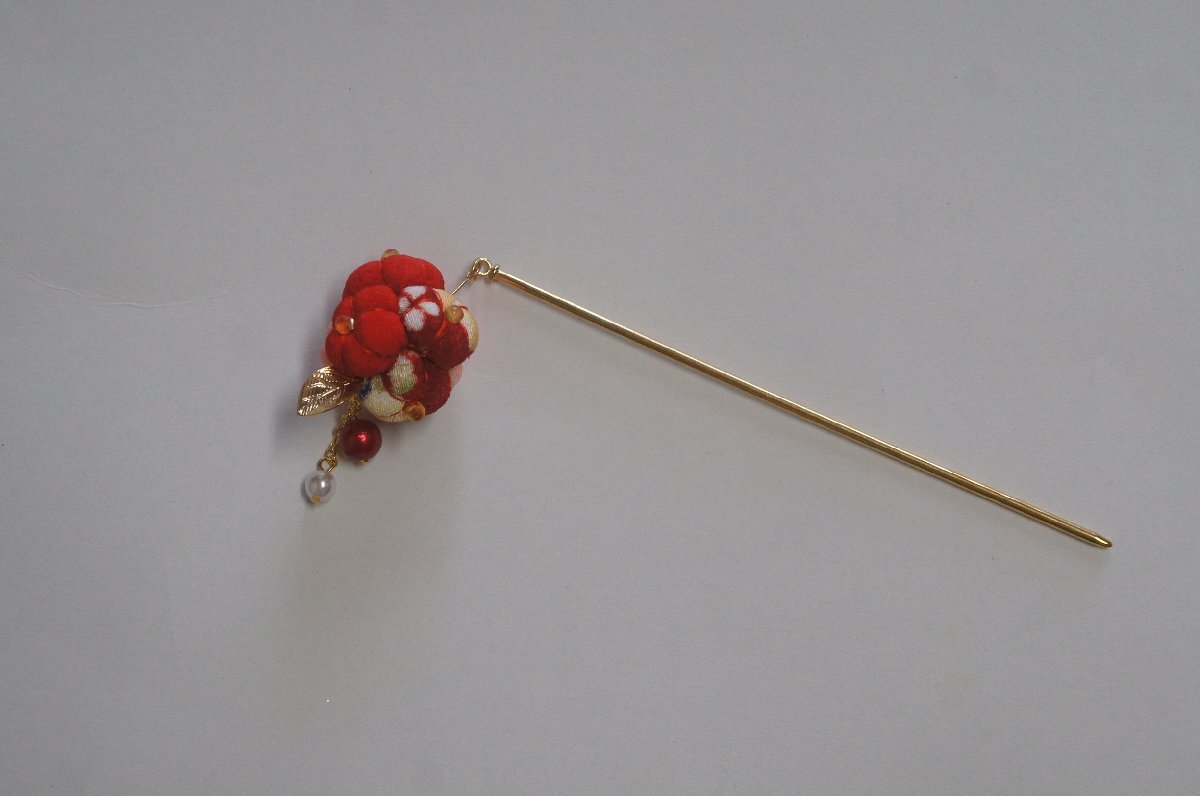 - お細工かんざし縮緬花鞠飾り未使用品『くろちく』ケース入り[E15446]