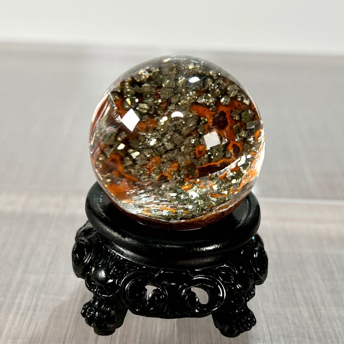 - 激レア パイライト&オレンジガーデンクォーツ共生 スフィア 7 台座付