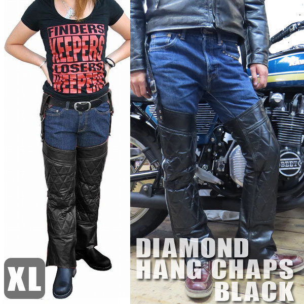 > 【HEAVY】(XLサイズ) レザーハングチャップス ダイヤモンドパッド ブラック ガーターチャップス HUNG CHAPS[HCG-02]