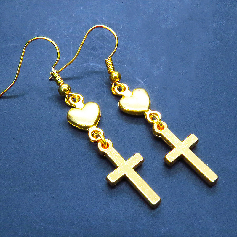 - ゴールドカラー ロザリオとハートモチーフを組合せたコンパクトなピアス サージカル可