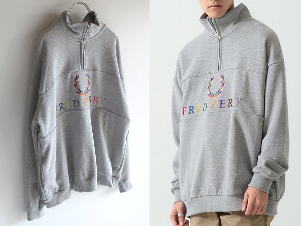 - BEAMS × FRED PERRY ビームス別注 フレッドペリー マルチカラー ローレルロゴ刺繍 ハーフジップスウェット ハイネックトレーナー L グレー