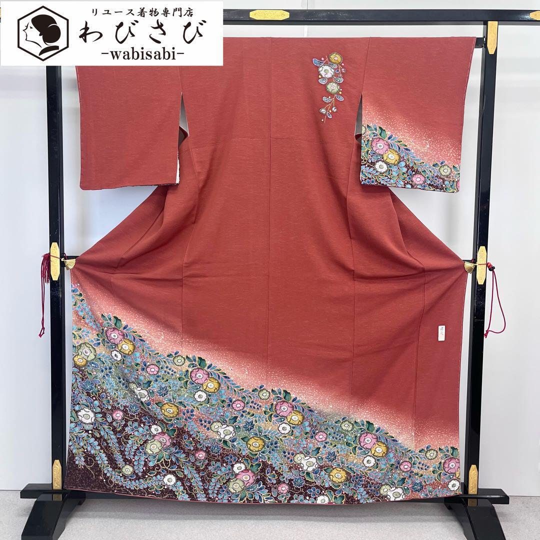 - 訪問着 作家物 辻が花絞り 金彩 海老茶色 しつけ糸 ガード加工 K-4077