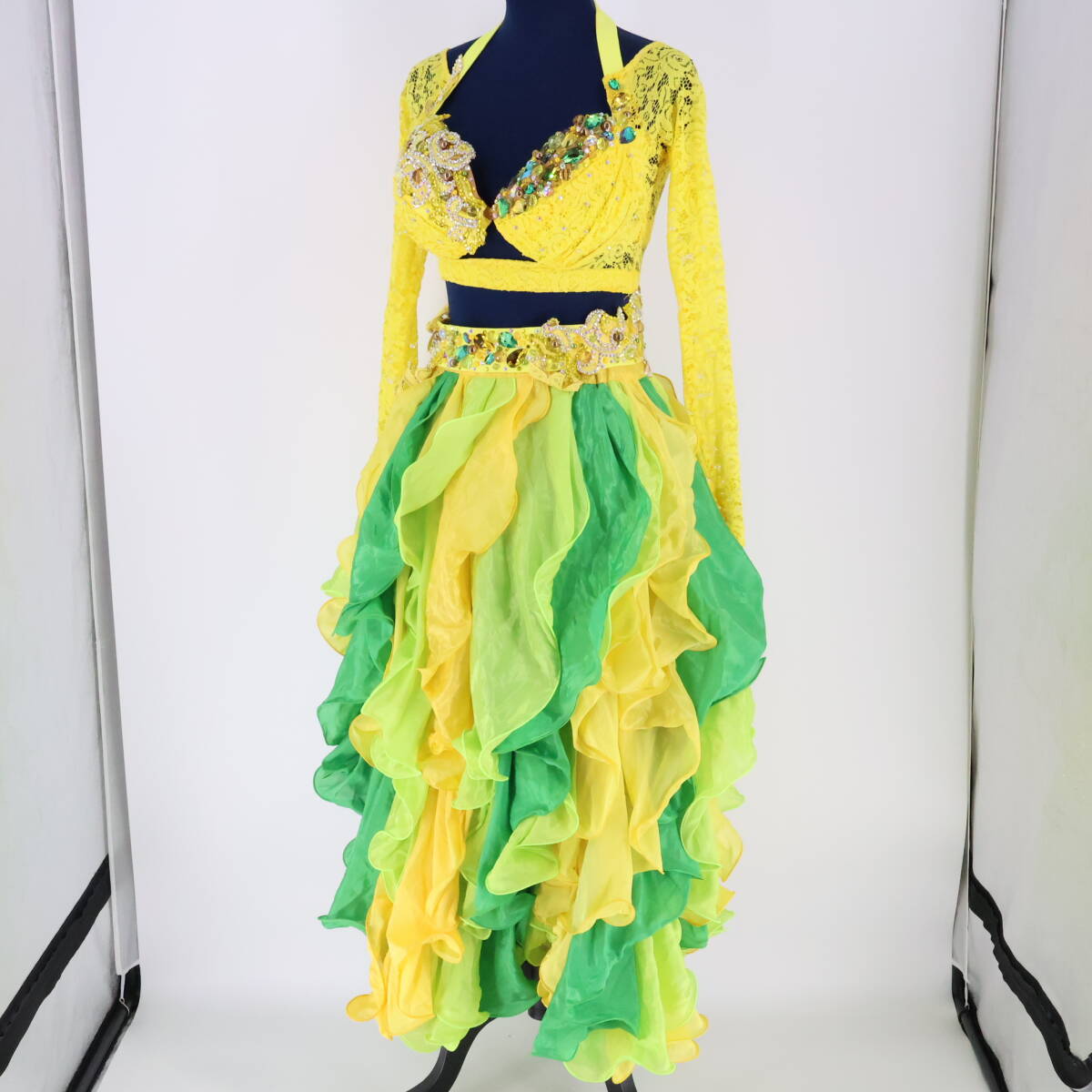 > 『送料無料』【ベリーダンス用 オリエンタル衣装】イエロー×グリーン POLINA ポリーナ ラインストーン フリル レース 黄色 緑 鮮やか