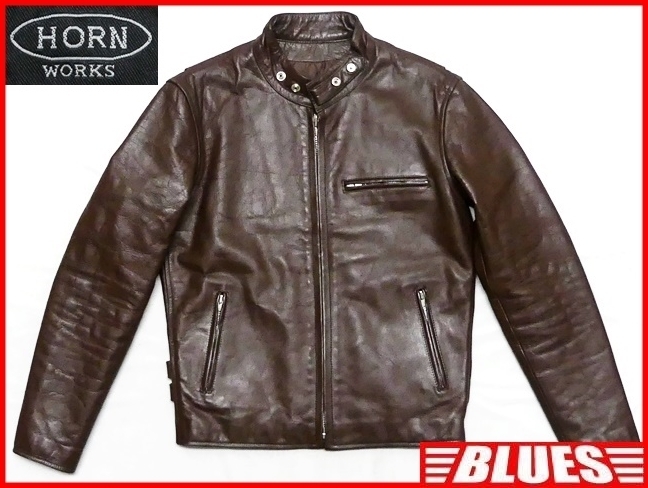 > 即決★HORN WORKS★メンズM レザーライダースジャケット ホーンワークス 茶 ブラウン 本革 シングル 本皮 パンクロック 立襟 ツーリング