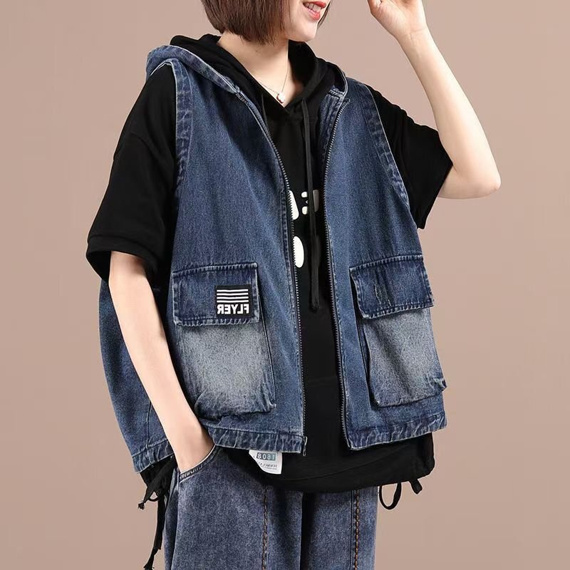 - LRM4434★レディース デニムベスト アウター ノースリーブ カジュアル 春秋 ゆったり 可愛い 大きいサイズ フード付き