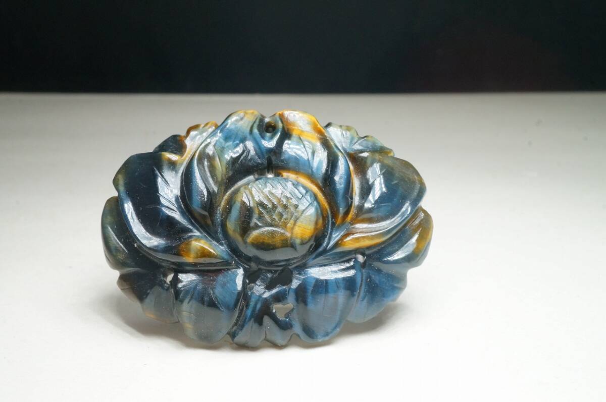 - 希少!30年前の原石を加工彫刻!極上天然紺虎目石タイガーアイ【椿】両面研磨 甲府の職人が彫刻研磨品13g