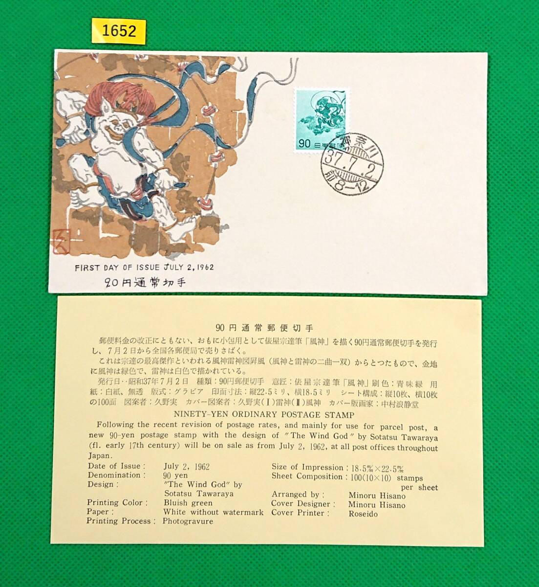 > FDC/普通切手/第2次円単位/Ⅱ風神/初日印/カシェ久野実/神奈川普通印/中村浪静堂/解説書有り/1962年7月2日/初日カバー №1652
