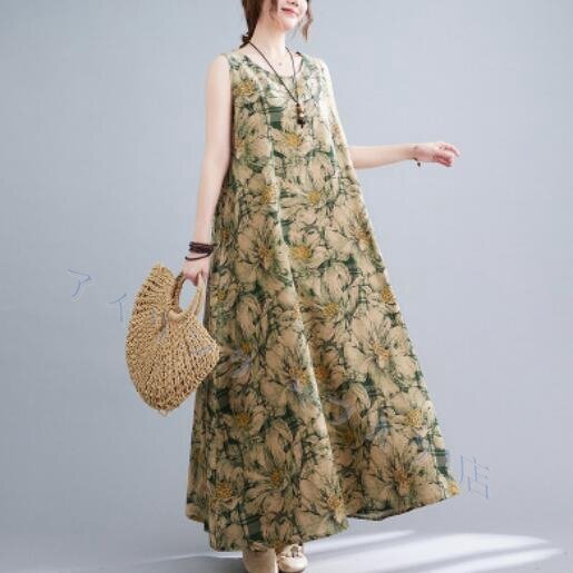 - ☆新品お花柄がおしゃれなレトロワンピ大きいサイズコットン風素材マキシ丈ネックノースリーワンピミリタリーグリーン