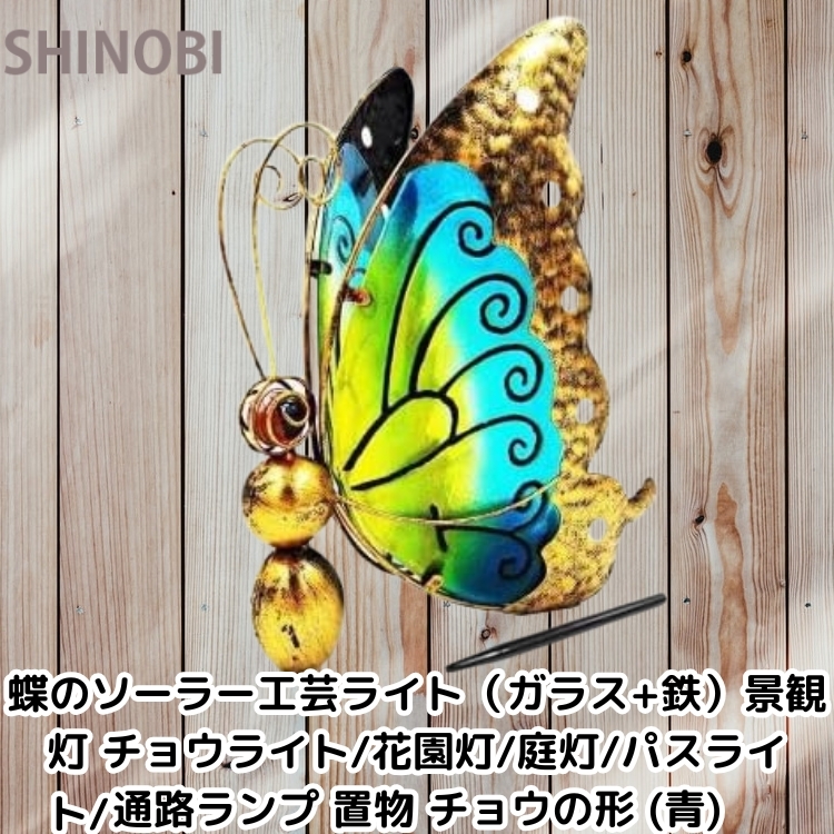 > 蝶のデザイン ソーラー工芸ライト 景観灯 チョウライト/花園灯/庭灯/パスライト/通路ランプ ガラス+鉄 置物 オブジェ チョウ (ブルー)