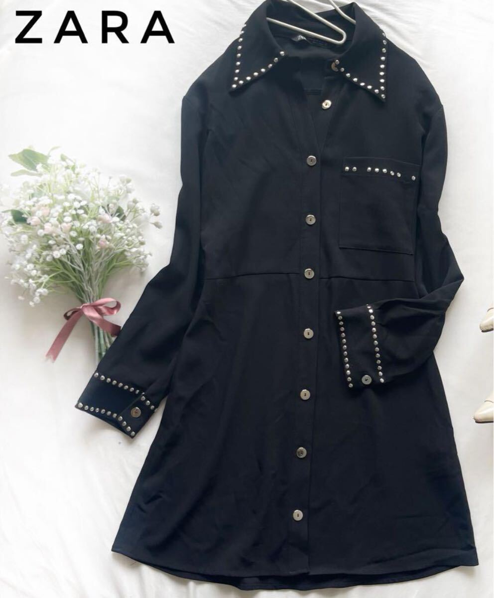 - ★ZARA★ スタッズ シャツ ミニ ワンピース 襟 長袖 黒 XS ブラック