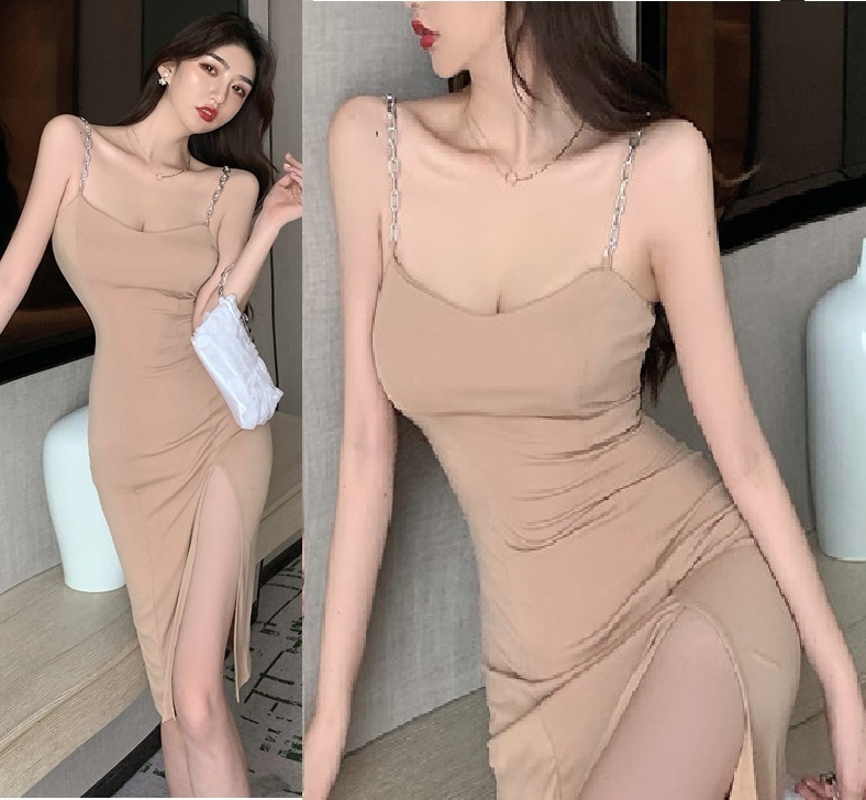 - 新品【魅惑Style】セクシー♪美スタイル♪シンプル*とろみ素材*スリット入*肩チェーン仕様*ひざ丈ロングワンピース*ベージュ DJ846