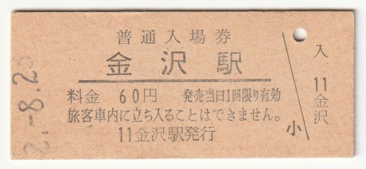 - 昭和52年8月23日 北陸本線 金沢駅 60円硬券普通入場券